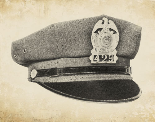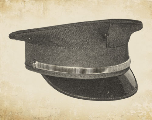 Unique style, as worn by Los Angeles Police Department. Made of navy blue laminated serge. Has oval shaped crown and higher front bevel; also a stiff wire sewn into crown welt, plus a rubber-like grommet positioned in upper interior of crown to maintain contour; shape C909 droop visor.