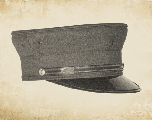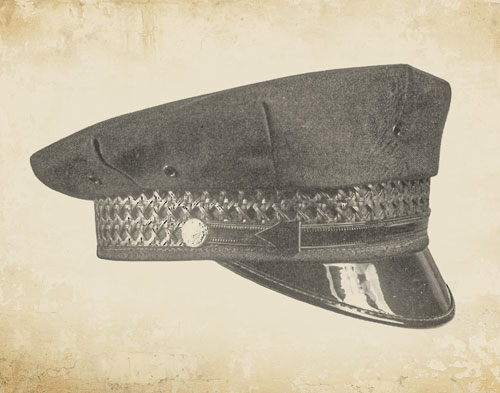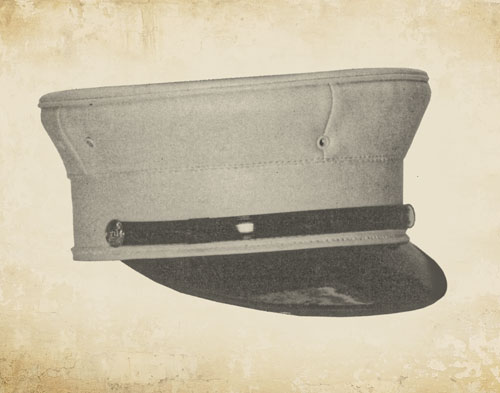 Top, bevels made of black serge fabric; black patent leather visor; nickel expansion strap affixed to cap with nickel California “Eureka” buttons.